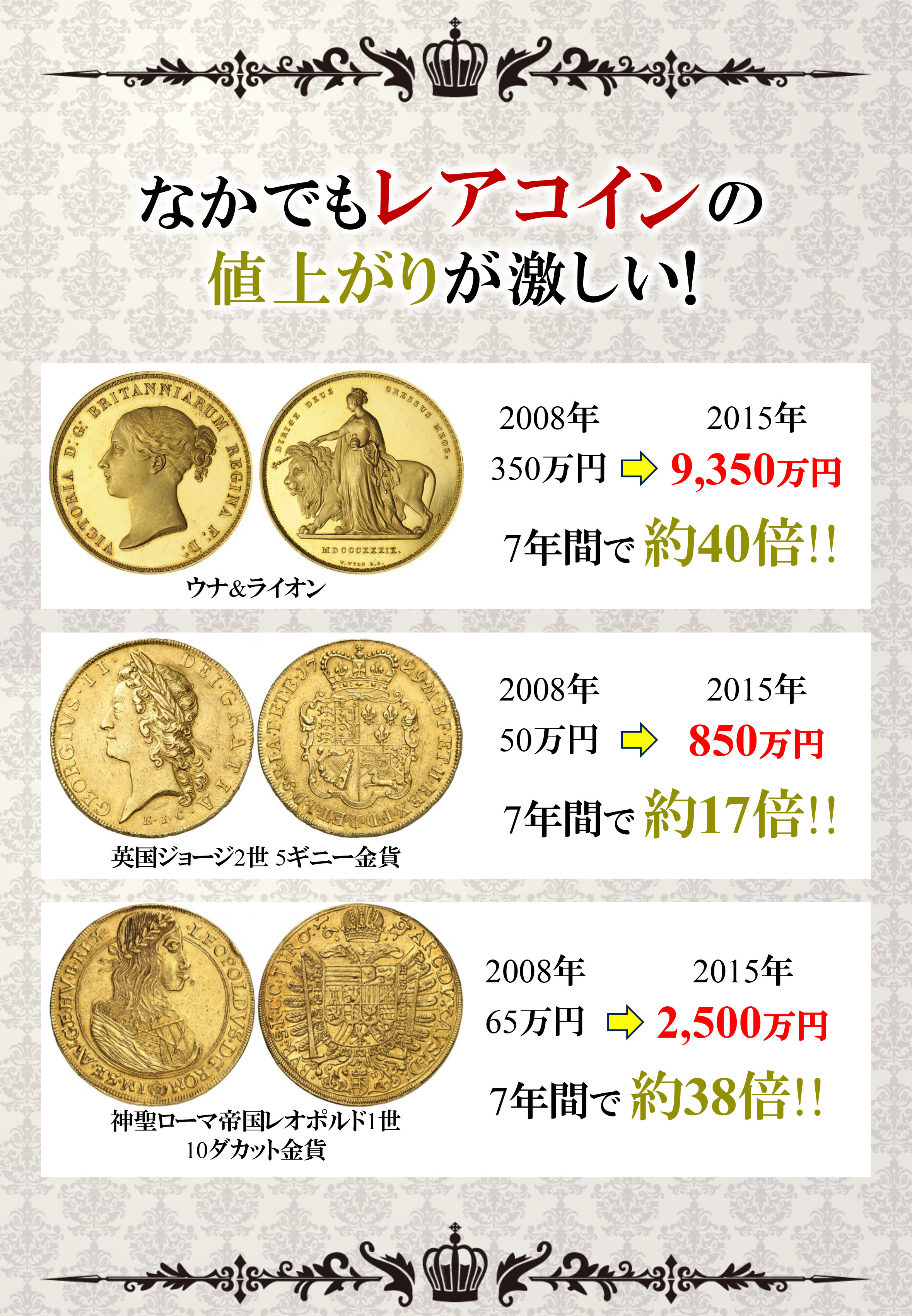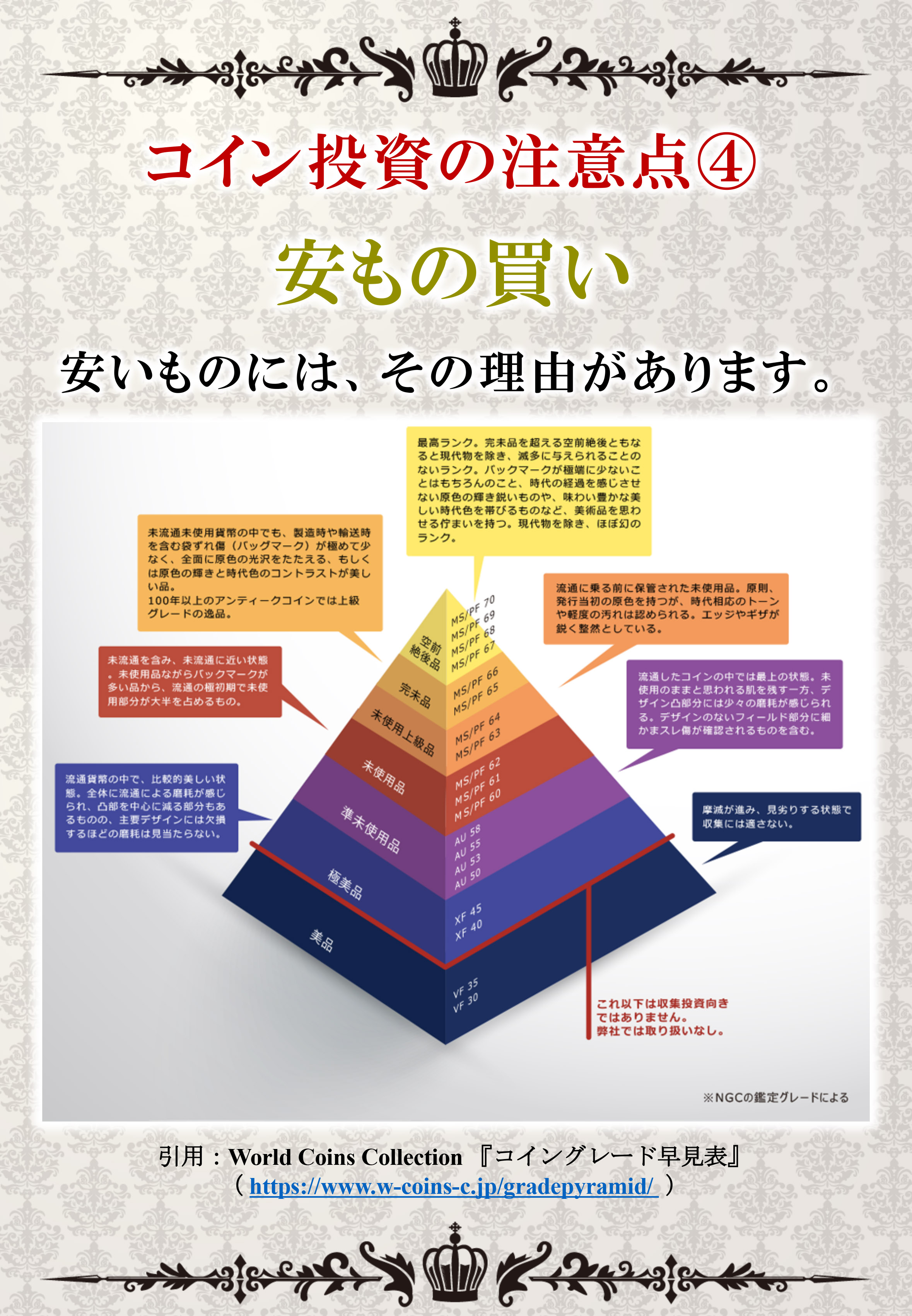 ◉将来のコイン価格が幾らになっていると言うのは占い師の専売で有ってコイン商が言うべき物では有りません!将来は誰にとっても未知数です。将来の価格が解ると豪語するのは詐欺師まがいで有り警戒すべきですが個々に示した価格推移は過去のデータに基づくもので有って一切の創作やヤラセは有りません!!!!!