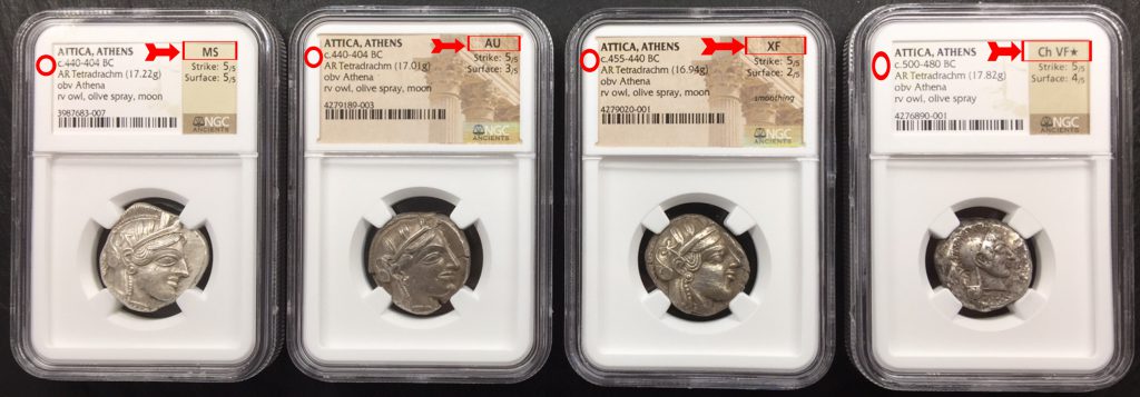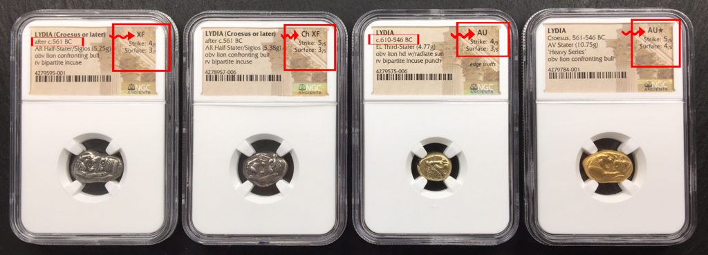 一般のコインで鑑定グレードはAU-58とかMS-63とかMS-65などのように数字で鑑定されますが、古代コインは「AU」と鑑定した後にStrike :4/5 Surface :3/5