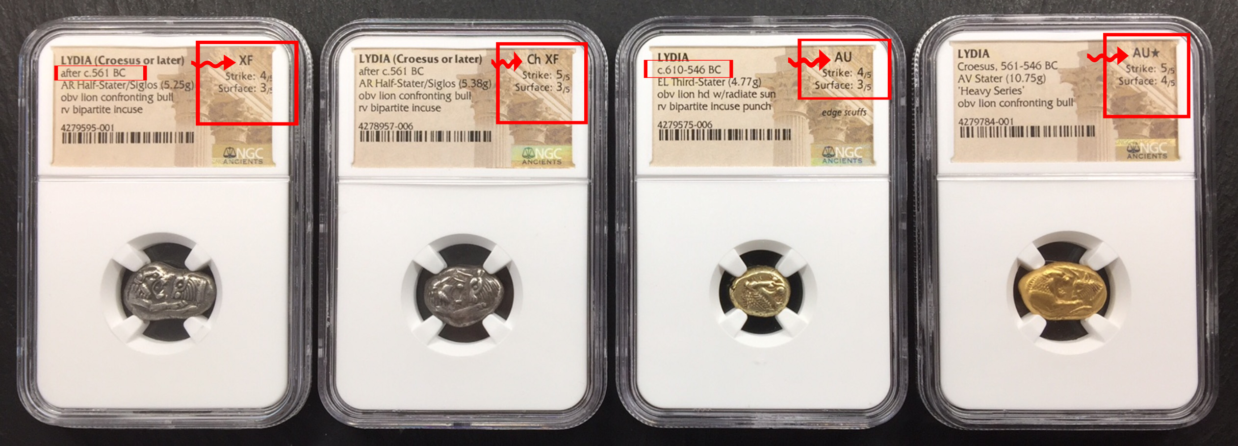 一般のコインで鑑定グレードはAU-58とかMS-63とかMS-65などのように数字で鑑定されますが、古代コインは「AU」と鑑定した後にStrike :4/5 Surface :3/5