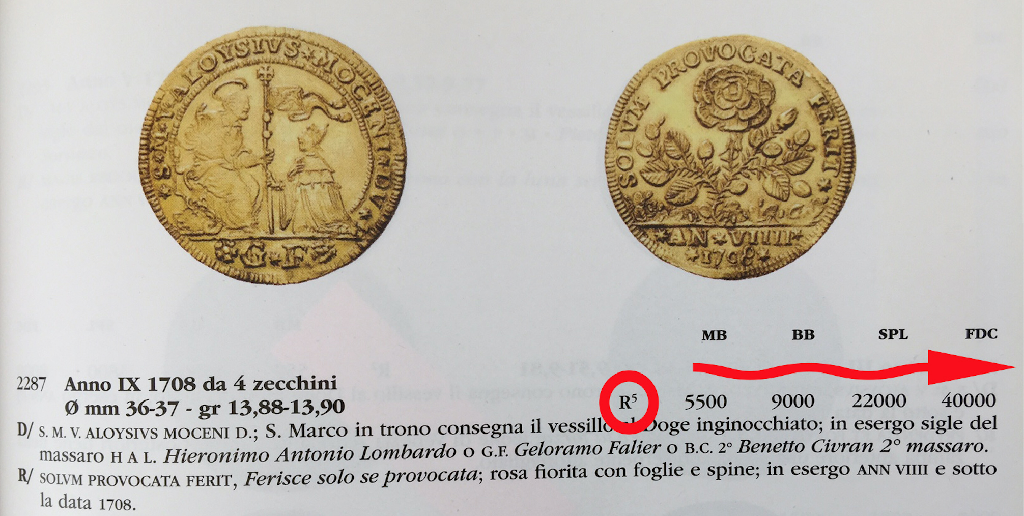 ↑ここでは一例としてイタリアのベネチアコインの希少品オセラ「R-5」を示すカタログを見て行こう。赤い◎で囲んだ中に「R-5」が見えています。これはこの金貨の発行枚数が「6枚から10枚」の希少性が高いコインという事を示している。価格はVFで5.500ユーロ次のEFだと約倍の9.000ユーロ、AUだと22.000ユーロでFDC(MSクラス)だと40.000ユーロとガイドしている。コイン保存状態が1ランク上がれば価格は倍に成るという法則が見えますね〜