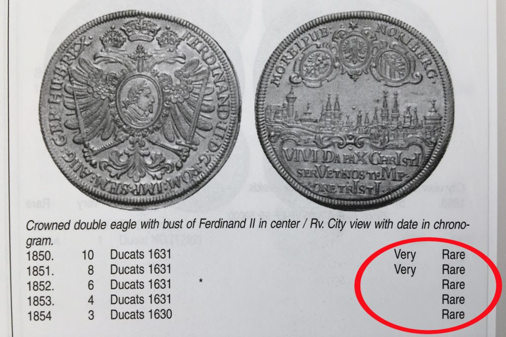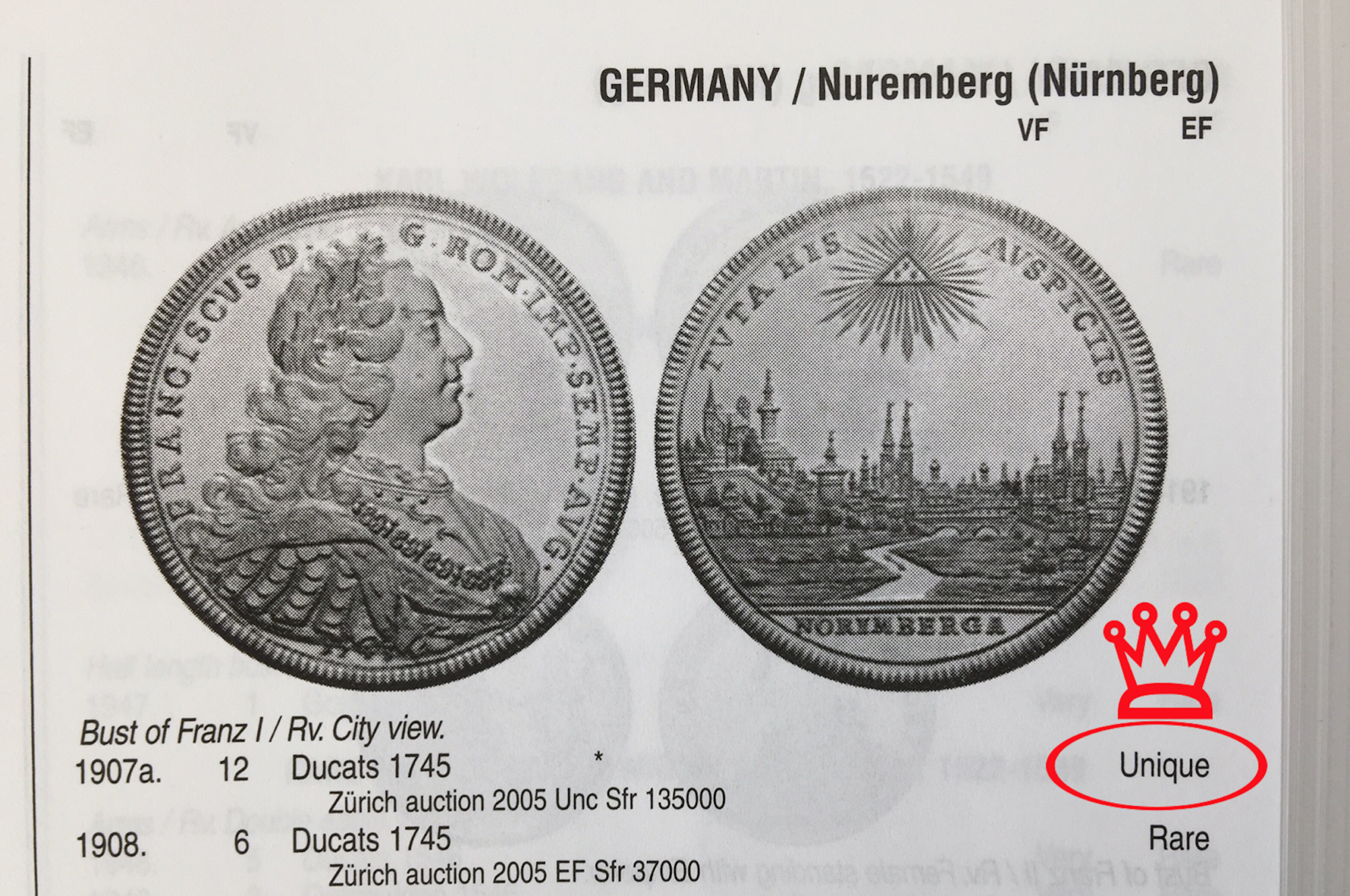↑「フリードバーグカタログ」の「レア度ガイド」の例を見て行こう。上記ニュルンベルグの12ダカット金貨は「Unique=ユニーク」と有るからこれは「究極のレア度」つまり発行が「1枚」又は現存が「1枚」という究極のレアコインカテゴリーで有る。